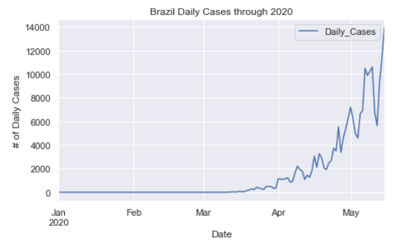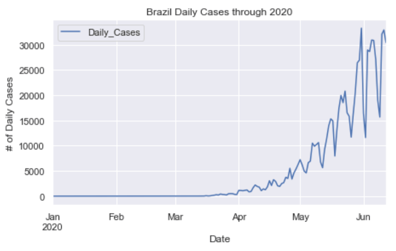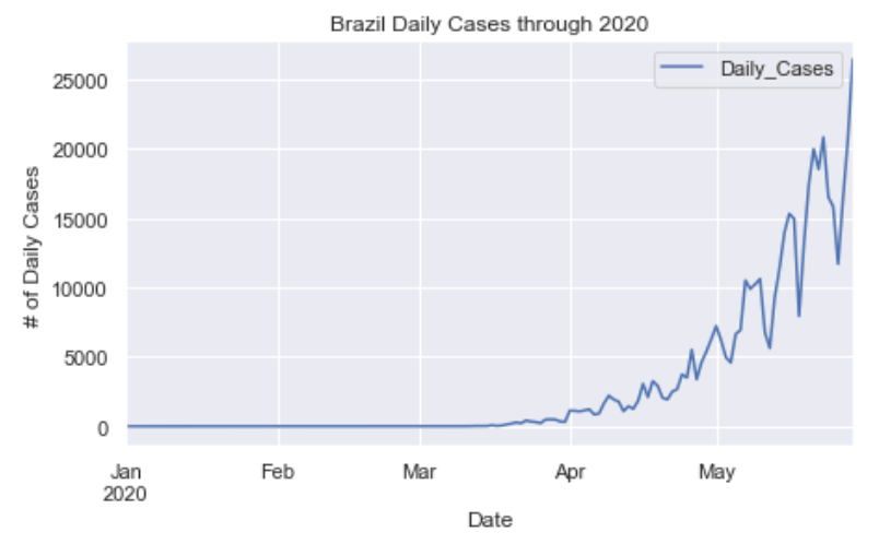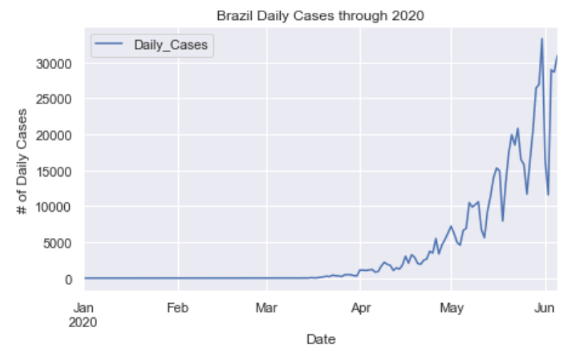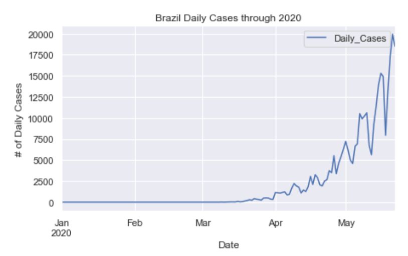 As you can see by looking at the various metrics, certain countries are handling the virus better than others. The United States has the most cases, and in comparison to the overall population, the number of cases is now one of the highest percentages in the world. Chile has the highest cases per capita with 1.6% of the population being confirmed to have had the virus. The European countries are also struggling the most in terms of deaths per capita, with the US and other North and South American countries close behind. European countries seem to have the highest death rates in general, with many hovering above a 10% death rate. France has an astonishing 17.7% death rate currently. Some of these high numbers may have to do with how often tests are administered. Testing only those with intense symptoms, would show a higher death rate. The US is now presenting a 4.4% death rate and about 0.92% of the population has been confirmed to have the virus. Death rates in general seem to be dropping as we are learning how to treat the virus better with time. South America is now beginning to really struggle with the virus, specifically Brazil.