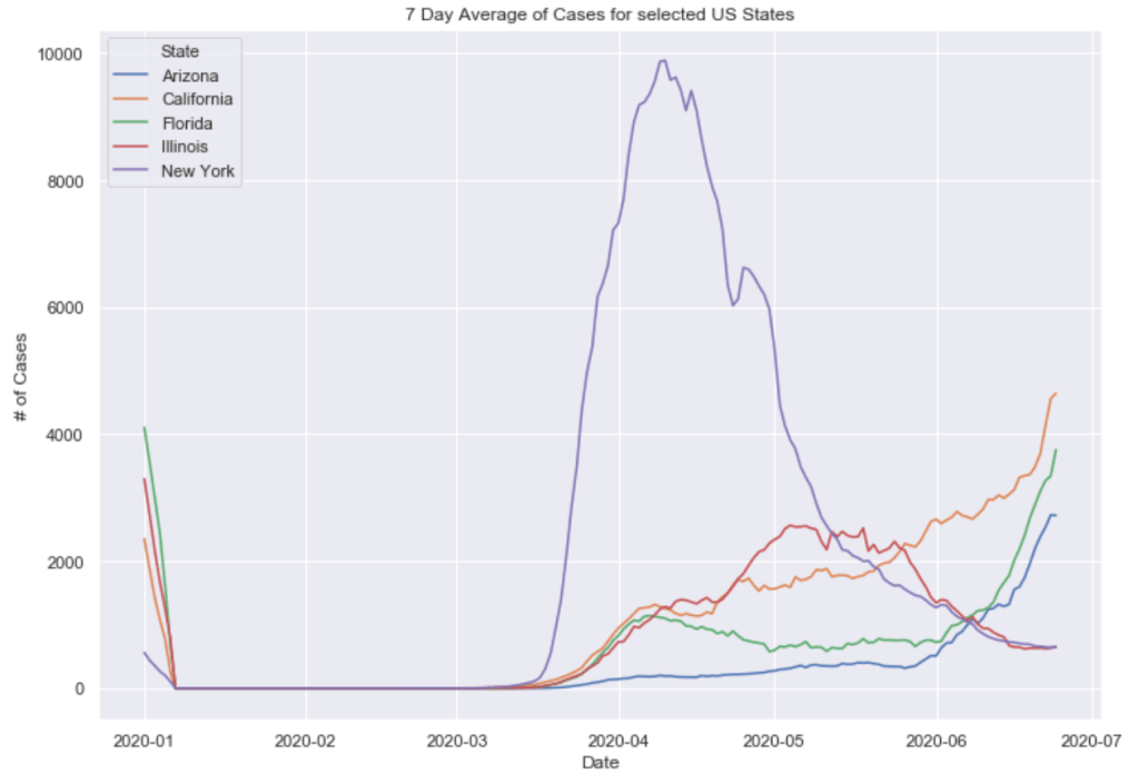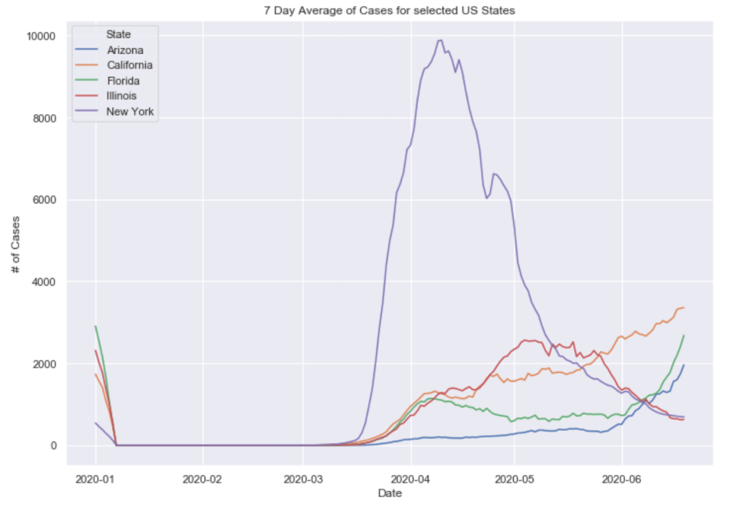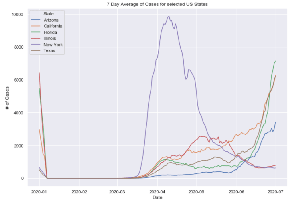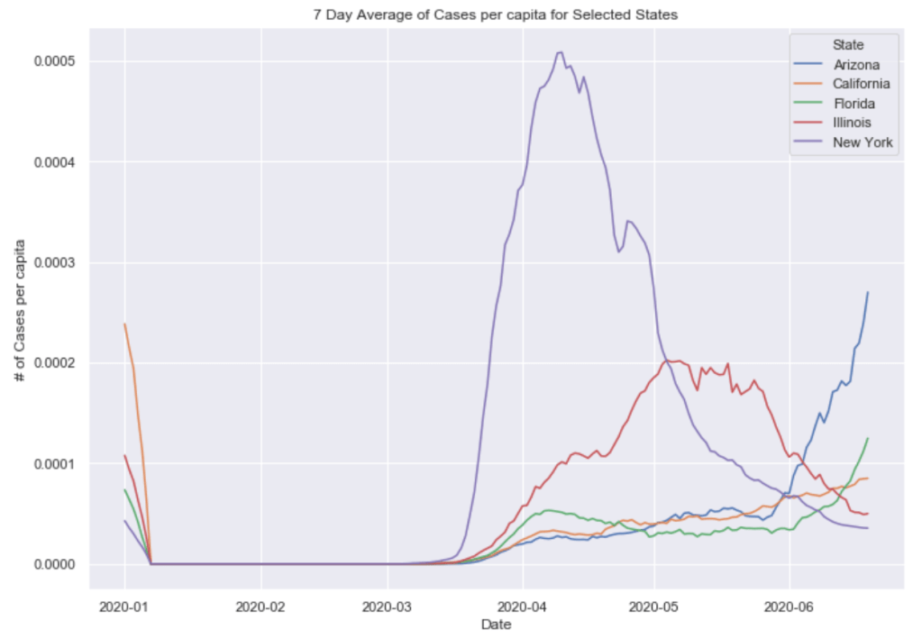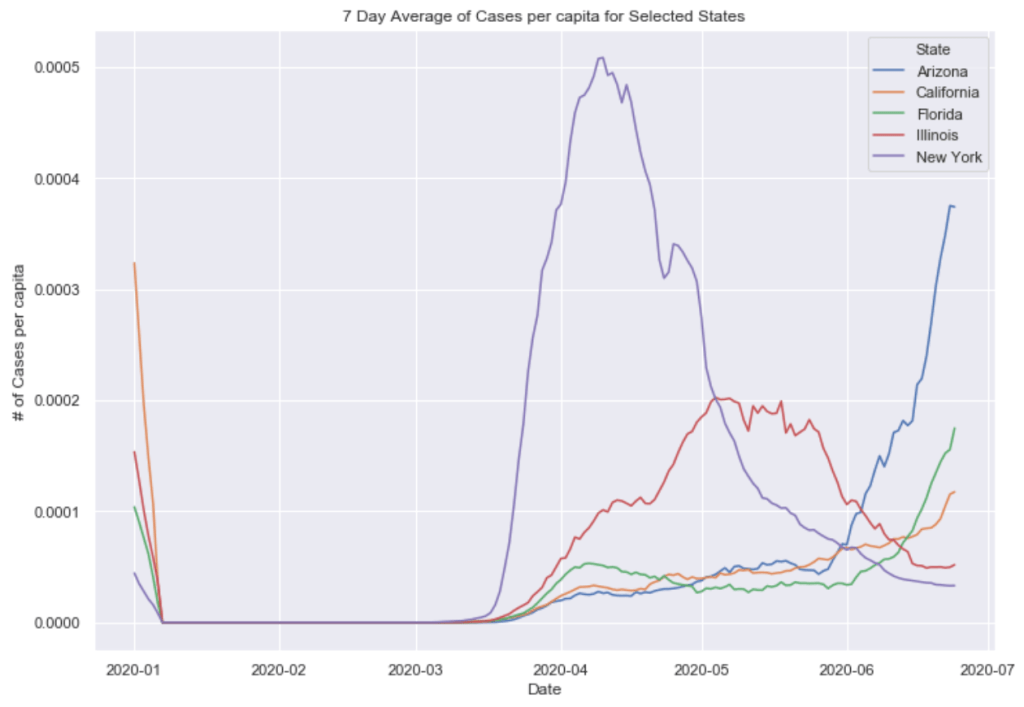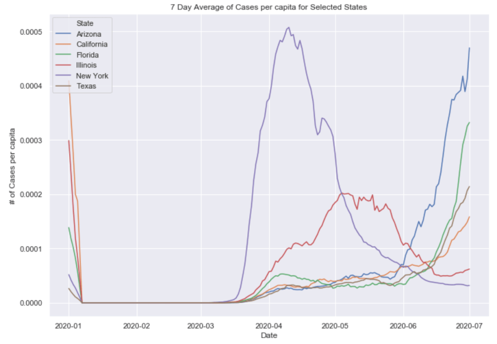 Many European countries have flattened the curve. South American countries are being hit hardest now and still have exponentially increasing cases. The United States is seeing an exponential rise in case numbers as restrictions have been prematurely loosened. In the US, New York has really turned it around and has a very low number of new cases per capita. Illinois has also flattened the curve drastically. California cases are still on the rise and have yet to flatten at all. Meanwhile, certain Southern states like Arizona have been increasing rapidly in cases. Other Souther states, like Florida, Georgia, and Texas are witnessing a dramatic new rise in cases and are now leading the country in average daily cases. Florida and Texas both look like they may be the new epicenter of the virus. These states have passed New York, Illinois, and California in terms of daily cases per capita.