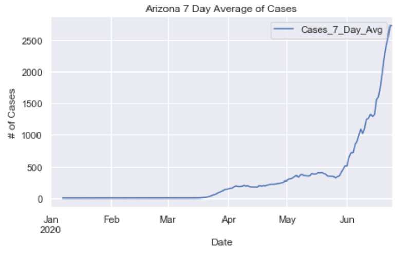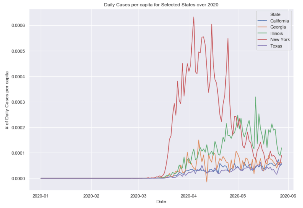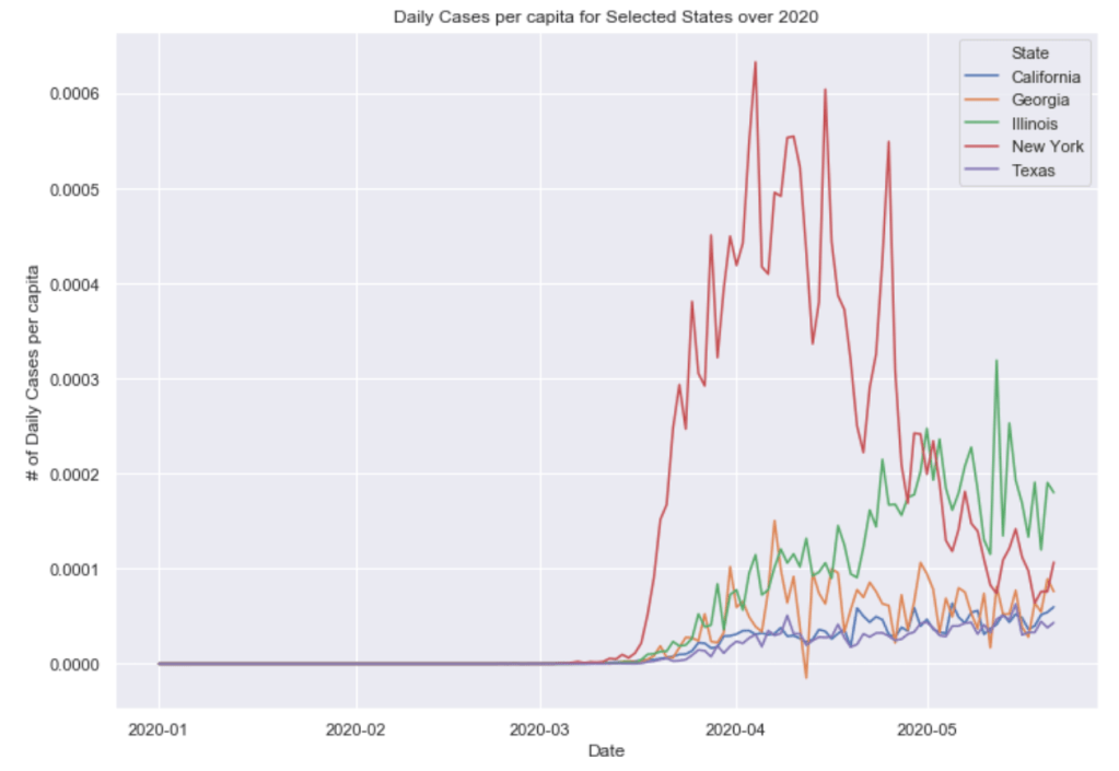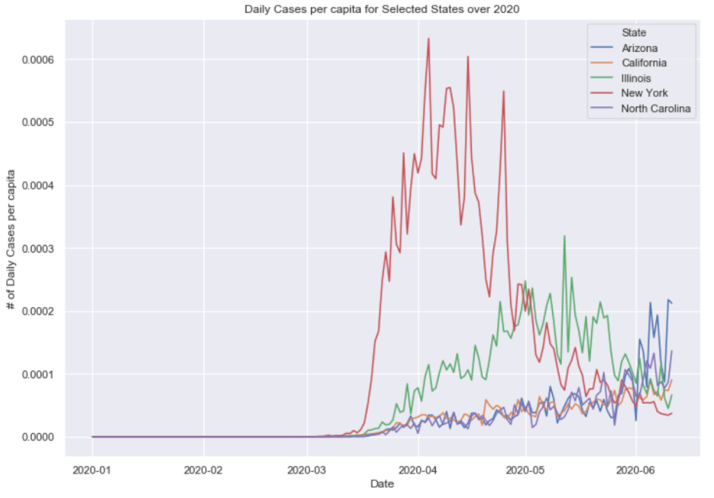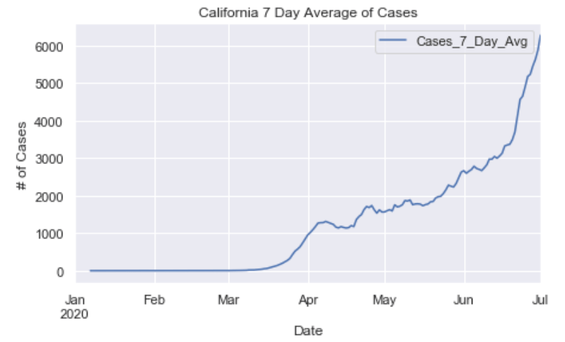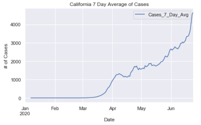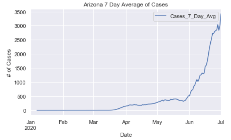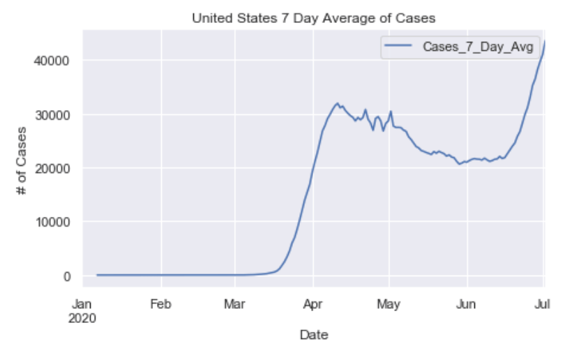 Many European countries have flattened the curve. South American countries are being hit hardest now and still have exponentially increasing cases. The United States is seeing an exponential rise in case numbers as restrictions have been prematurely loosened. In the US, New York has really turned it around and has a very low number of new cases per capita. Illinois has also flattened the curve drastically. California cases are still on the rise and have yet to flatten at all. Meanwhile, certain Southern states like Arizona have been increasing rapidly in cases. Other Souther states, like Florida, Georgia, and Texas are witnessing a dramatic new rise in cases and are now leading the country in average daily cases. Florida and Texas both look like they may be the new epicenter of the virus. These states have passed New York, Illinois, and California in terms of daily cases per capita.