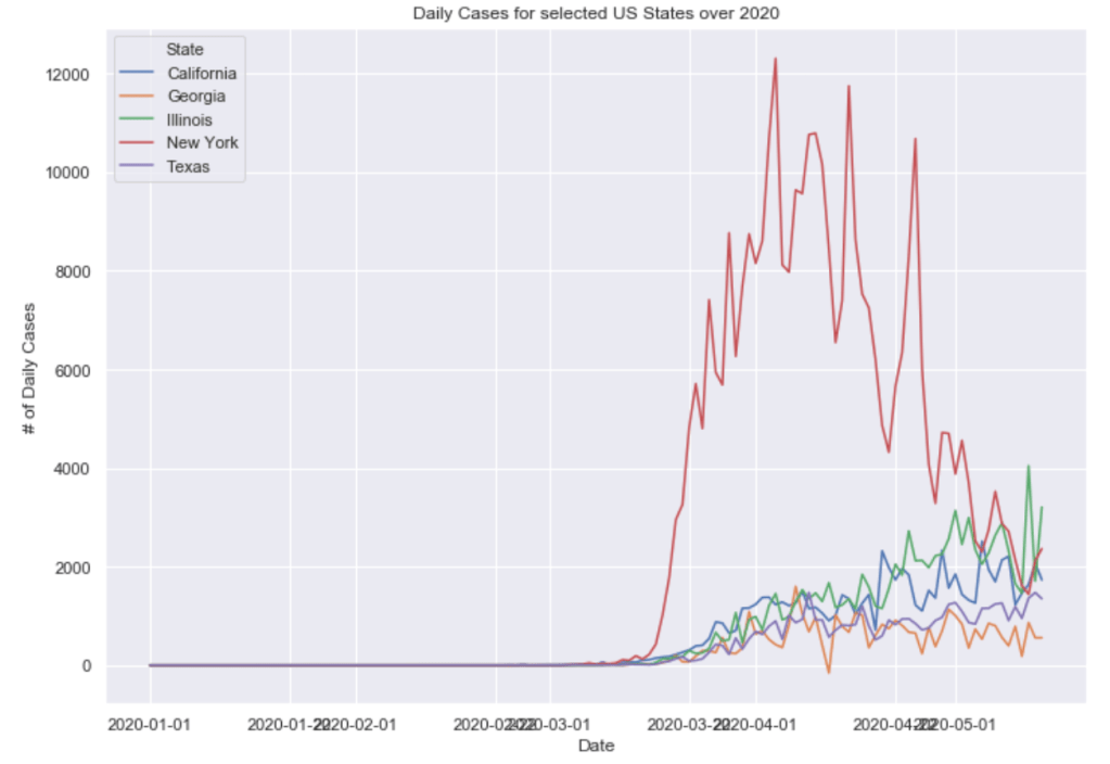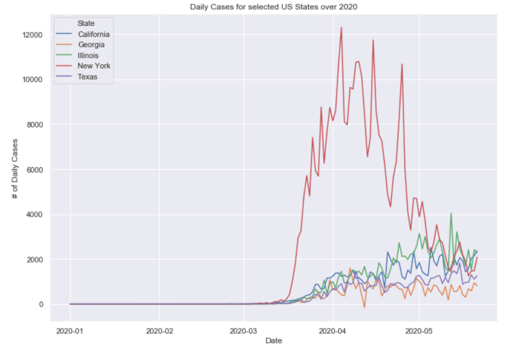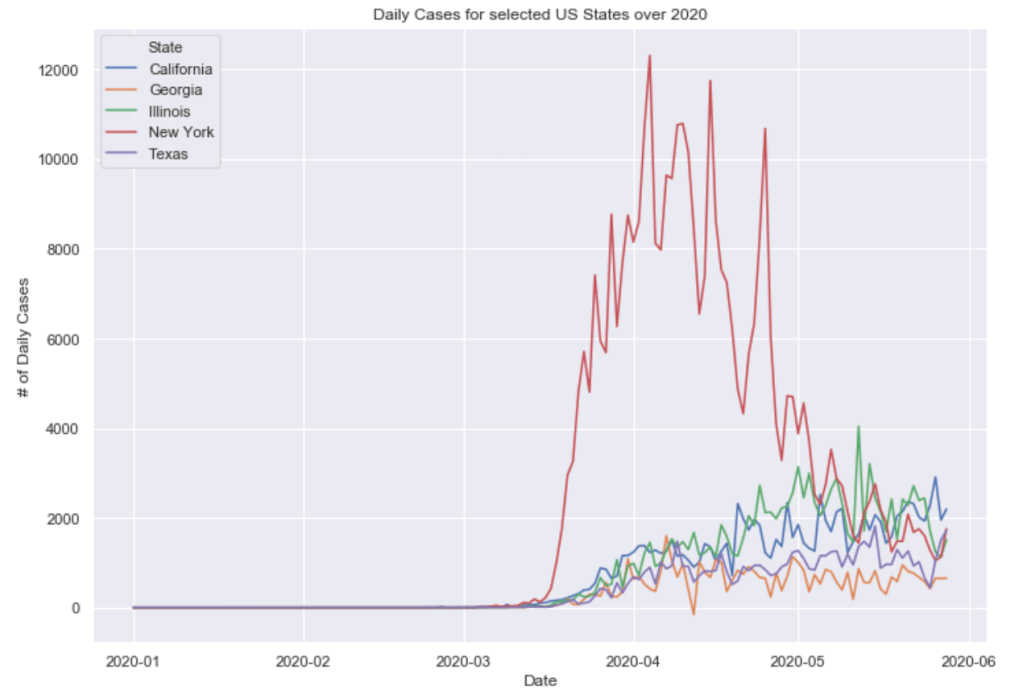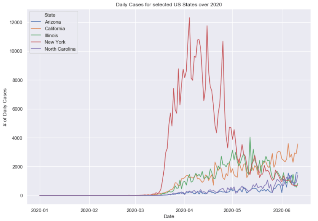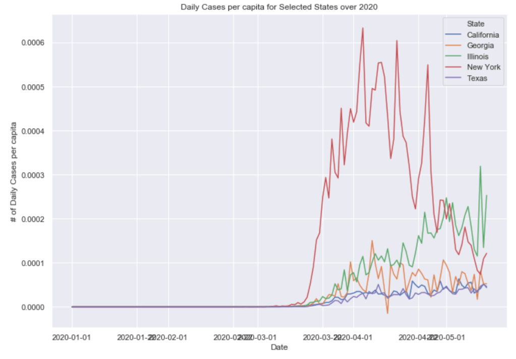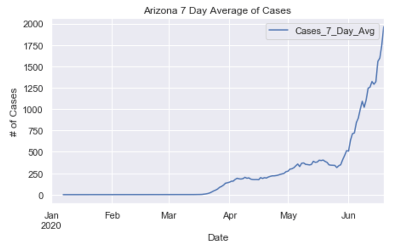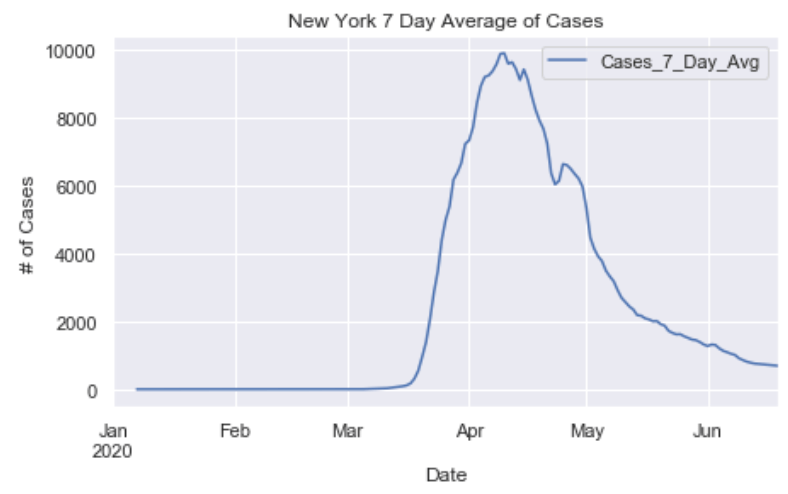 Many European countries have flattened the curve. South American countries are being hit hardest now and still have exponentially increasing cases. The United States is seeing an exponential rise in case numbers as restrictions have been prematurely loosened. In the US, New York has really turned it around and has a very low number of new cases per capita. Illinois has also flattened the curve drastically. California cases are still on the rise and have yet to flatten at all. Meanwhile, certain Southern states like Arizona have been increasing rapidly in cases. Other Souther states, like Florida, Georgia, and Texas are witnessing a dramatic new rise in cases and are now leading the country in average daily cases. Florida and Texas both look like they may be the new epicenter of the virus. These states have passed New York, Illinois, and California in terms of daily cases per capita.