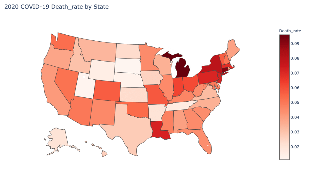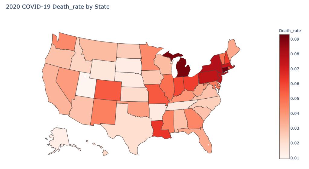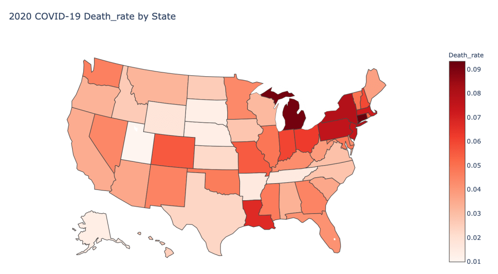 In the United States, certain states are facing worse COVID circumstances than others. The New York area has been hit the hardest, with both New York and New Jersey having a very high number of cases and deaths. California, Texas, Arizona, and Florida are seeing a dramatic rise in cases as of late due to loosened restrictions. Many states are reversing reopening plans. Death rates in general are declining due to better treatment, however we may see a rise again if hospitals become overcrowded in states with surging cases.