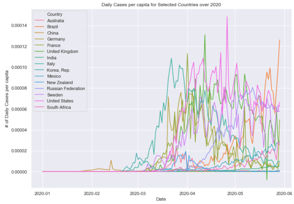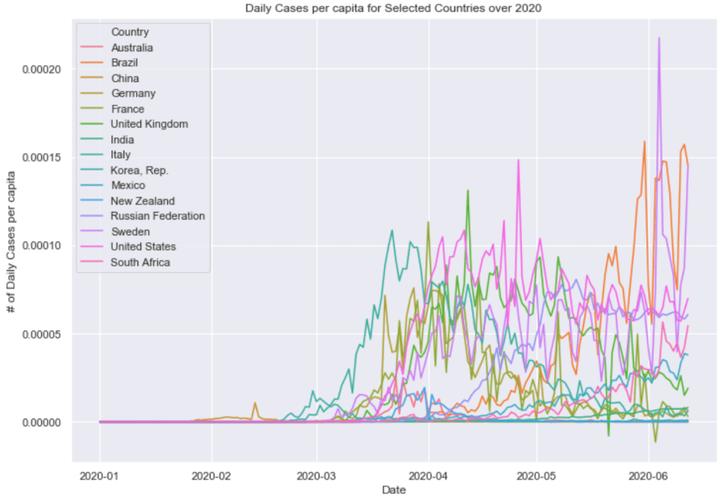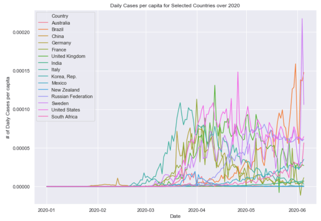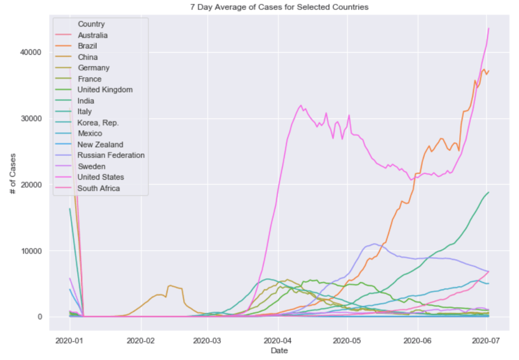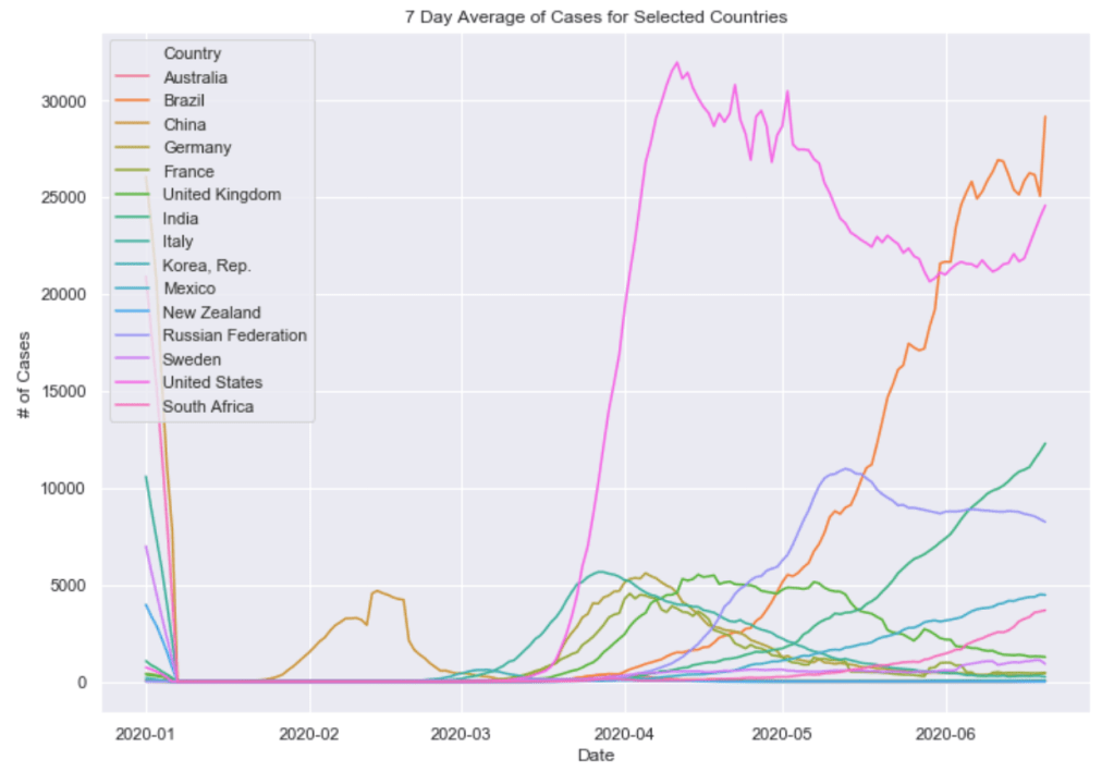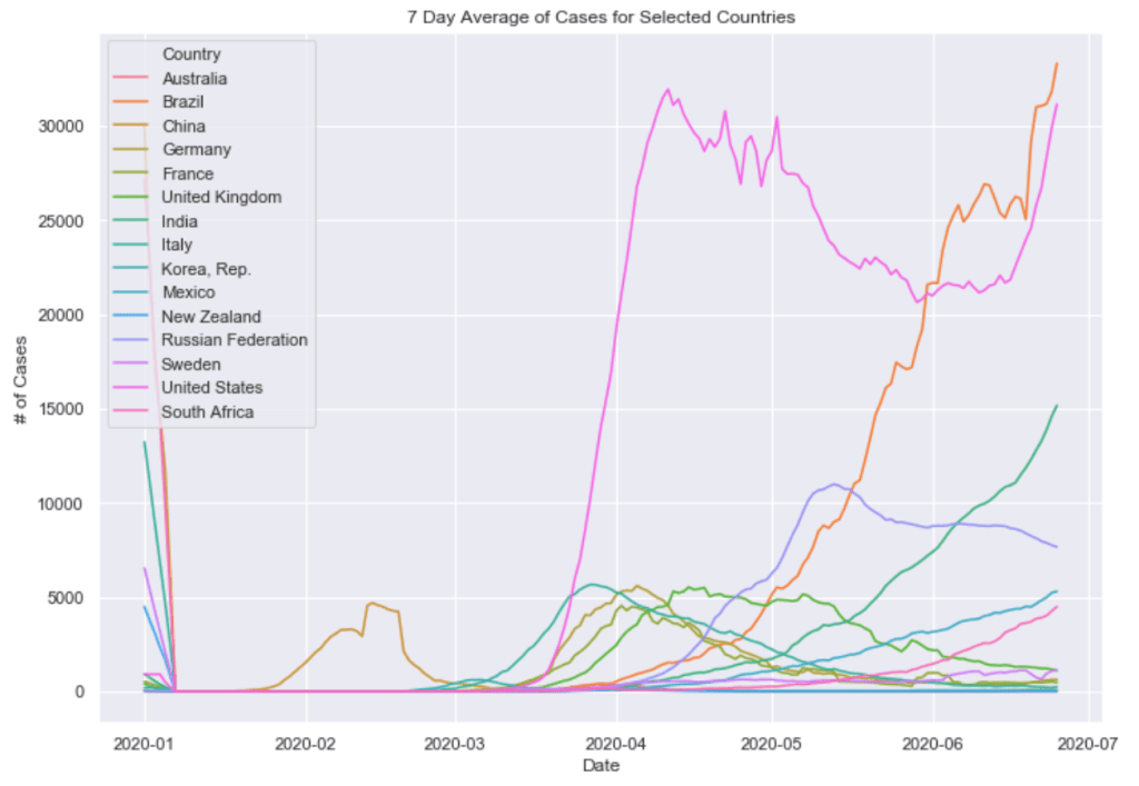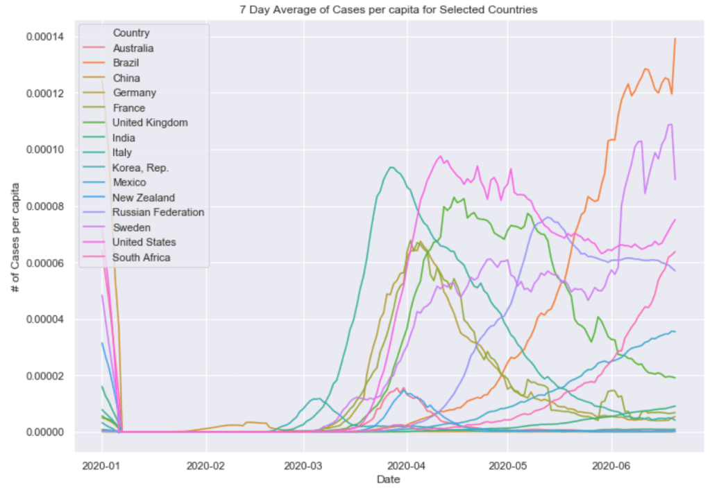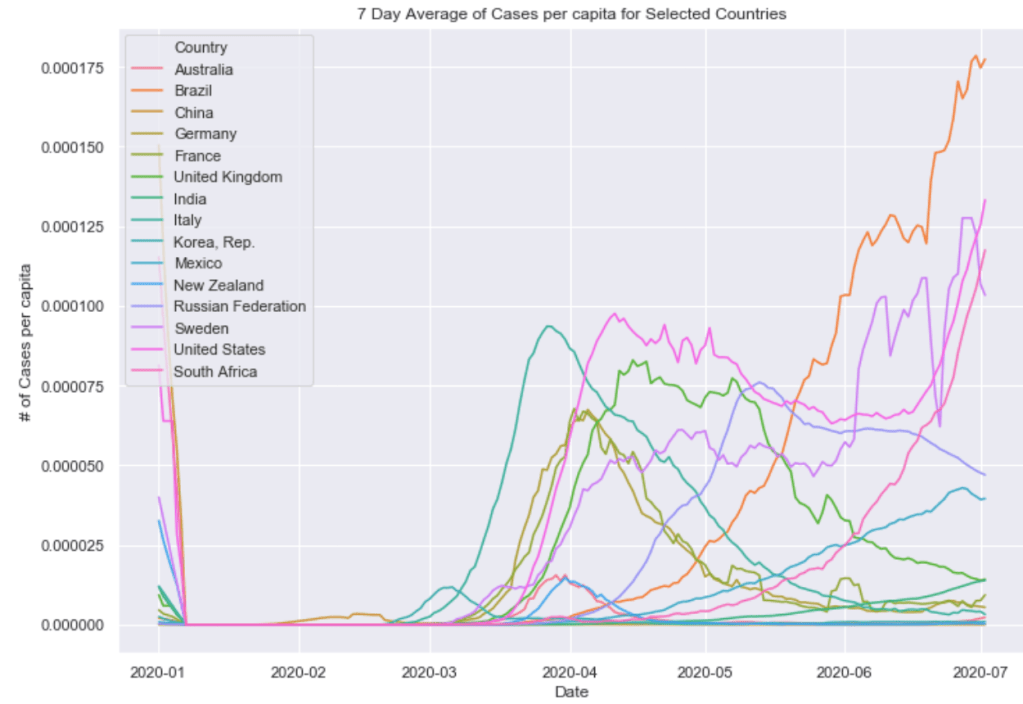 Finally below these graphs are two graphs combining these countries all into a single plot. One of 7 day average of daily cases and one of 7 day average of daily cases per capita. The United States and South American countries are doing the worst job of controlling the virus as of now.