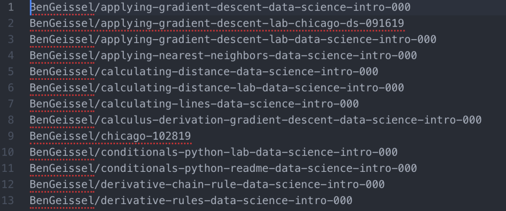 At this point, you should be left with a list of repo names that you DO NOT want, separated by a new line. Save this file somewhere easy to access and name it unwanted_repos.txt (so you can remember what it is)